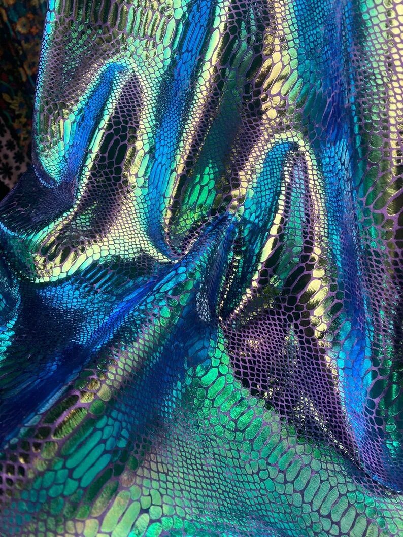 This fabric is stunning with it's iridescent dragon scale shimmer. Purple ice velvet face with smooth spandex on the reverse. This is suited for cool weather, it's quite dense but does have some 4 way stretch.