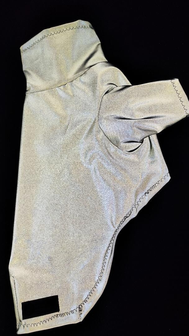 This unique fabric is a stretchy spandex base with a reflective glass bead coating. Completely washable, hang to dry.