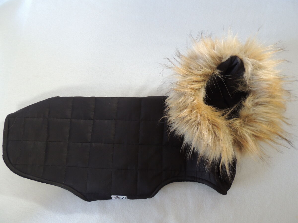 This quilted parka is lined in Polartec Windpro in black with the quilted lining inside the hood. Faux fur trim, please HAND WASH ONLY.