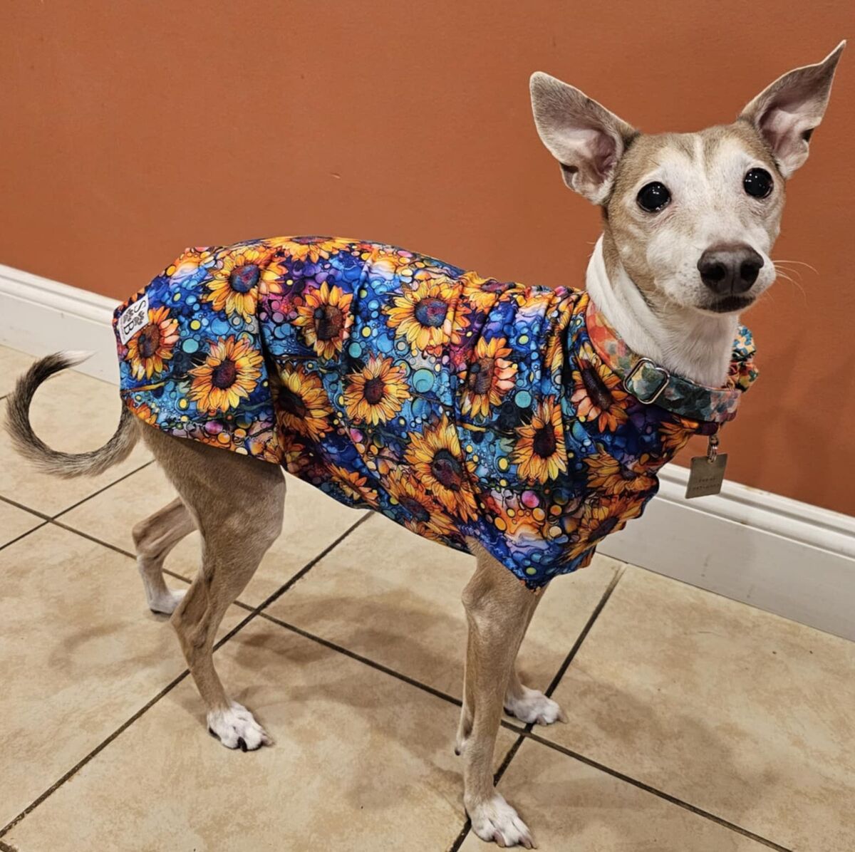Fine European organic bamboo and cotton/lycra knit fabrics in several weights, lots of prints and stretch. Custom made for your small dog. These sleeveless styles are great for growing dogs, puppies and lounging around the house. No sleeves make it very versatile to wear alone or layered and perfect for transitional weather. I can make this style with any of the knits you see in the shop.